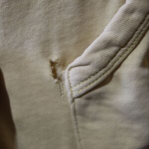 • Heavy distressing with holes and missing drawstring grommets