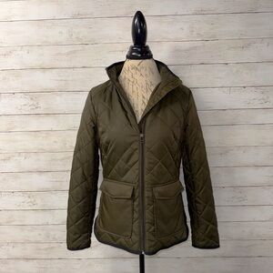 L.O.G.G. By H&M size 6 quilted jacket in a dark olive green. Black textured trim along short collar, cuffs, & hem. Fleece lined collar & front zip close panel. Large flap hand pockets. Long sleeves. Decorative split side hem detail. Lined.