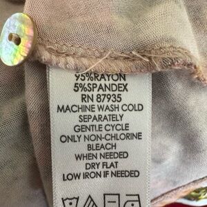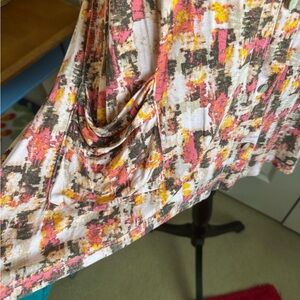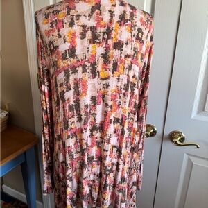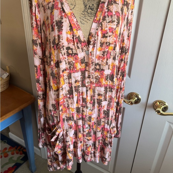 Stylish cardigan with an abstract pattern. Features a blend of muted colors. Cute pockets on front. Has Handkerchief Hem!