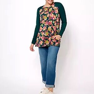 This top features a fab floral with a solid sleeve for a colorful coordinated look. NWOT and has pockets! ❤️ Lori Goldstein! Made from a blend of 90% rayon/ 10% spandex. Super soft top! Length measures 25 inches. Armpit to armpit measures 18 inches. Arm length measures 23 inches. Machine washable, tumble dry. Is sized XS (could also work as a small size.)