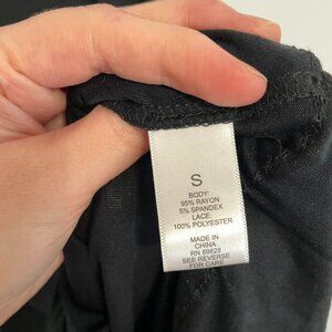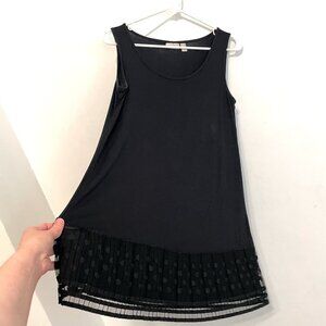 ◇ size US small. Solid black body with black pleated pleat mesh overlay trim at hem. Mesh features polka dot and horizontal striped prints / mixed prints. Has stretch. "Semi-fitted" - according to brand. Scoop neck and sleeveless. Seems to be long longer tunic length. A-line style tank top blouse top shirt