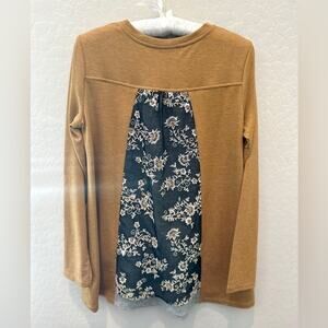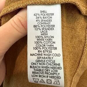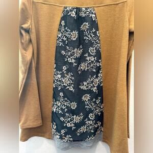 LOGO BY LORI GOLDSTEIN | Mustard V-Neck Tunic Top Lace Hem & Floral Back | XS