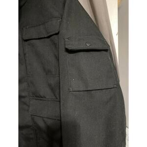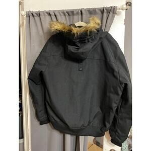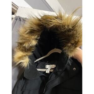 L.O.G.O / H& M WO size large Black Canvas hooded with faux fur quilted coat multi pockets. ZIPPER SMAP AND HOOK LOOP CLOSURE STRETCH HEM AND CUFFS LENGTH MEASURES APPROX 29” FROM SHOULDER TO HEM SLEEVES MEASURE APPROX 25” CHEST MEASURES APPROX 24” from side to side