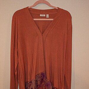 LOGO By Lori Goldstein Long Sleeve V Neck Cardigan, Hi/Low Sheer Printed Ruffled Bottom, Medium Brown Color , 1 enclosure at chest, Size Large 23" across Chest, 90% Rayon, Great for Layering over Tank or T Great for Office, School or night event