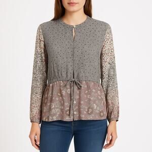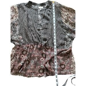 Keywords: LOGO by Lori Goldstein, LOGO Lavish, boho blouse, patchwork top, floral print, animal print, eclectic style, XS, drawstring waist, peplum top, casual blouse, festival style, hippie, eclectic, artsy, feminine, coverup, jacket, kimono, bohemian
