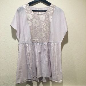 Features: sheer, oversized style, scoop neckline, extended shoulders, front and back waist seam with shirring, center front and back burnout detail
