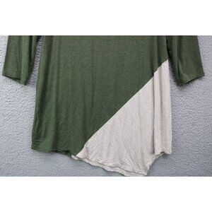 LOGO Layers 3/4 Sleeve Asymmetrical Hem Tunic-Size Small. Item is in Excellent Condition. The material is 95% Rayon and 5% Spandex. Laying flat measuring armpit to armpit it is 19'' and 22.5''-33.5'' in length.