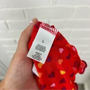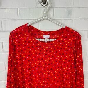 Good pre worn condition. LOGO Layers by Lori Goldstein. Color is fiery red 3/4 sleeve length top. Mesh style shirt with an all over heart pattern. Size large. Lettuce edge hemlines. All sales final.