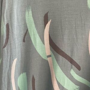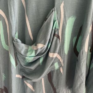 This super soft flowy tunic top is from the LOGO by Lori Goldstein line. The pullover top buttons all the way down with tiny faux wood buttons. It features an artsy print with dashes of mint green, lavender and gray. The cute little front pockets and shark bite hem add charm to this longline tunic top. It is a women’s size small. Fantastic condition!