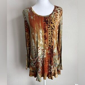 LOGO Lori Goldstein Brown Teal Abstract Print Long Sleeve Tunic Blouse Womens M