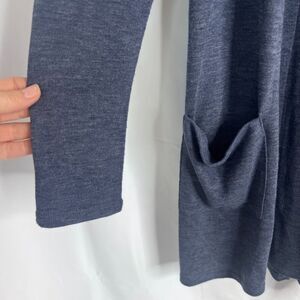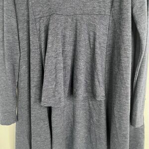Open front, long sleeve, ruffle in middle of back, front pockets, tunic length, soft and comfy