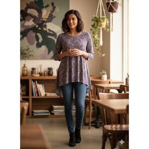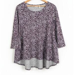 Show off your bold and artistic side with this vibrant tunic from LOGO by Lori Goldstein. This top features a fun and funky purple leopard print on a soft, comfortable stretch-knit fabric. The flattering A-line swing silhouette and high-low hem create beautiful movement and a relaxed fit.