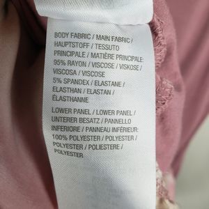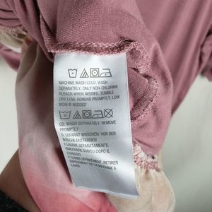 Scoop neck, short sleeved, tunic-length top with hip pockets and ruffle peplum tie-dye hem. Pink/rose color. Soft and stretchy material