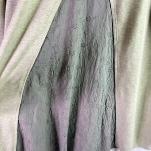 Good preowned condition with mild wear and pilling seen. Features pockets on the front, and a floral embroidered backside. That portion has stylized holes at center of flowers. Knit material is lightweight and stretchy.