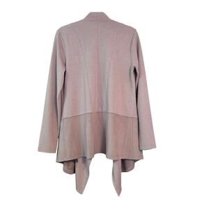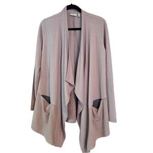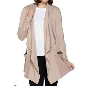 Layer yourself in a lush, contemporary cardigan from LOGO Lounge by Lori Goldstein and look as good as vou feel. Its classic cardi design gets fashion-forward updates from a flattering cascading front, pockets with a pop of contrast color, and a faux-suede hem. Made from soft, comfortable French terry fabric. From LOGO Lounge by Lori Goldstein. Great condition, size small