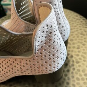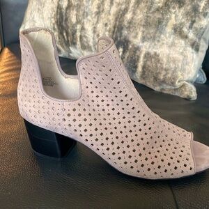 Worn only a few times; ankle-length booties are a blush-like or pale dusty rose color in a perforated pattern suede-like leather; pull-on design, open-toe. Great with dresses or jeans for a mod, contemporary look; chic and stylish.
