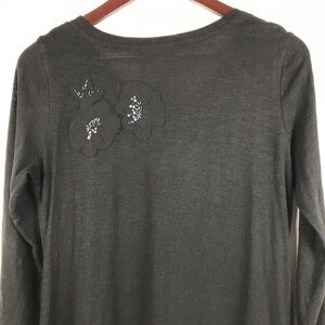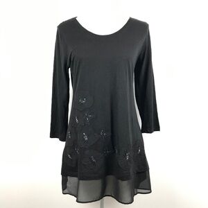 Lori Goldstein black tunic top, embellished floral appliqué and beads in front and back, chiffon trim hem, 3/4 sleeves.
