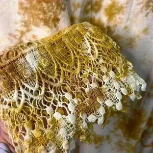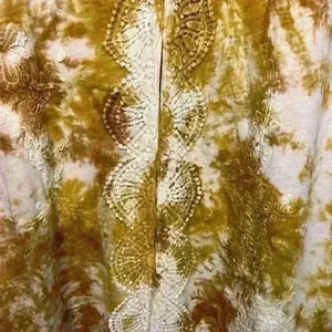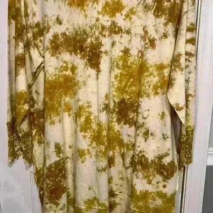 LOGO Lavish by Lori Goldstein duster with a V-neck. NWT Women’s hand tie dye - no two are alike. It has cream and gold colors. It also has appliqués throughout. The bottom of the 3/4 sleeves are crochet. It has hook and eye front closure. It also has pockets. This is a very unique piece that would be a great addition to you wardrobe. Made in India