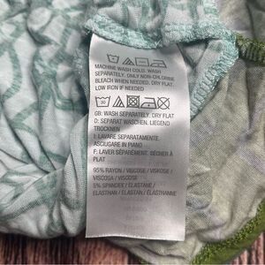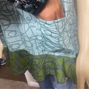 Women’s scoop neck, allover print, short sleeves, contrasting ruffle trim, single side pocket above hi-low hem