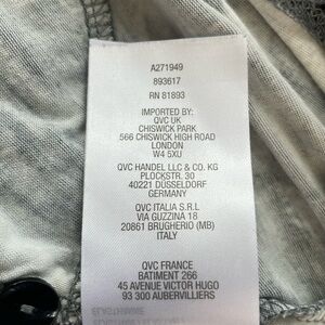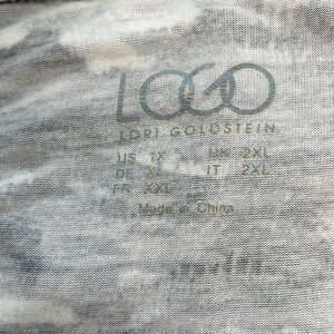 LOGO by Lori Goldstein blue, gray, white camo like print buttoned cardigan/ long sleeve shirt. Size 1X. In good preowned condition. No stains. Very soft. V-neck. Armpit to pit measures 23 inches. Top of shoulder down front 29 inches. Down sides 33 inches. Comes from a smoke free home.