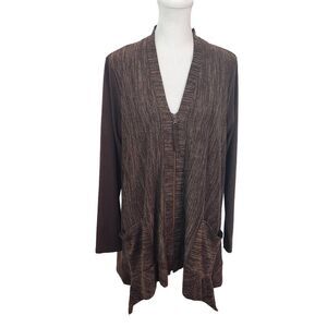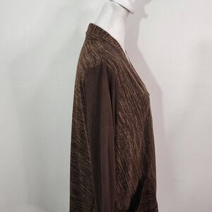 LOGO by Lori Goldstein brown lightweight knit cardigan with soft suede-feel sleeves. Comfy cardigan features a shark bite hemline, pockets, and long sleeves. Great condition!