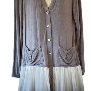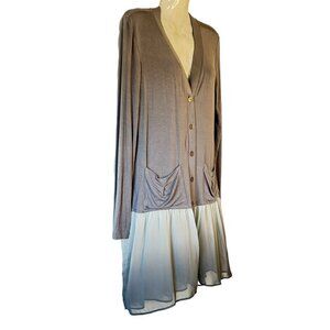 LOGO by Lori Goldstein Oversized Jersey Stretch Cardigan Tunic is Periwinkle Grey with Ombre Peplum Button Down with Abalone Buttons V-Neck Long Sleeves and Ruched Front Pockets Whimsey Goth BOHO Bohemian Cottage Cottagecore Funky Art to Wear Artsy Alternative Unique Soft Comfortable Lightweight Breathable Stretchy Slouchy