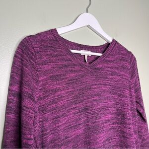 LOGO by Lori Goldstein women’s shark bite hem cashmere and cotton sweater in purple and black heather. Size XS.