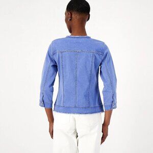 With this LOGO twill jacket, you've landed your look! Frayed edges add a fun, unexpected twist to this classic cover-up, and spandex gives you the flexibility to style it with just about anything you own. It's that best friend you'll never break up with. From LOGO by Lori Goldstein®.