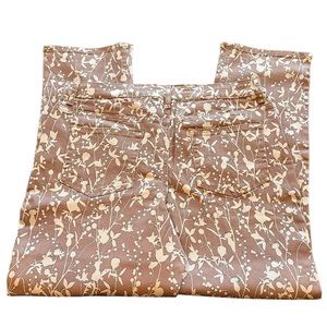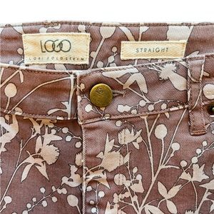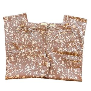 Beautiful pair of straight leg jeans by LOGO (Lori Goldstein). They're frosted taupe with a floral pattern in a very pale gray. Five pocket design with button and zipper closure. Stretchy and comfy.