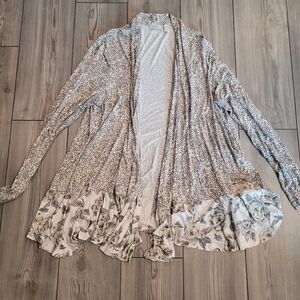 LOGO Womens L Mixed Print Open Front Cardigan With Pop Pockets Neutral Colors. long sleeves and lots of stretch