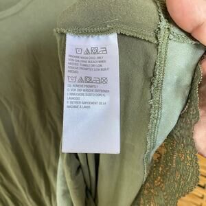 Soft and flowy LOGO by Lori Goldstein tunic top in a muted sage green shade with feminine lace trim and layered hem detail. Features 3/4 sleeves, scoop neckline, and relaxed fit—perfect for layering or everyday wear. Tagged size 3X (fits true to size). Lightweight and comfortable fabric with a touch of stretch.