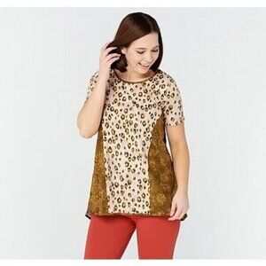 LOGO by Lori Goldstein Print Blocked Cotton Modal Hi-Low Hem Top Olive Branch,S