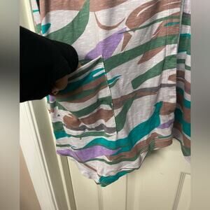 Pre owned grey printed open Front Cardigan top with snap closure, patch pockets and handkerchief bottom hem. 60% cotton, 40% modal. Size 1X, from pit to pit 24 inches, length 31 inches. I good used condition.