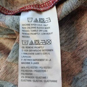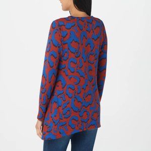 LOGO by Lori Goldstein asymmetrical hem tunic sweater top in women's size XL. Red and blue printed fabric. Long sleeves. One front hip patch pocket.