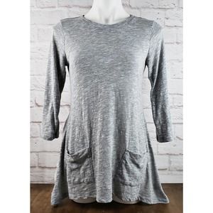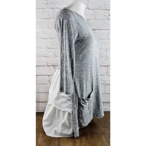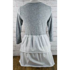LOGO by Lori Goldstein heather gray top with white Swiss dot tiered fabric in the back; 3/4 length sleeve; two front hip pockets; hi-lo hem