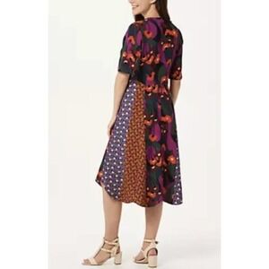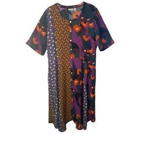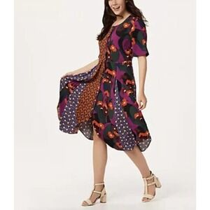 Features: mixed prints, scoop neckline, button-front closure, elbow-length sleeves, front and back waist seam with panels and godets, side-seam pockets