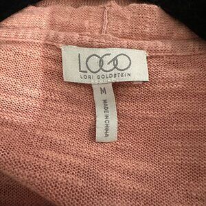 This LOGO by Lori Goldstein cardigan in size M is a chic addition to any wardrobe. Made from a cotton linen blend, this peach-colored long sleeve open cardigan offers both comfort and style. It has been steamed or laundered and comes from a smoke free home.