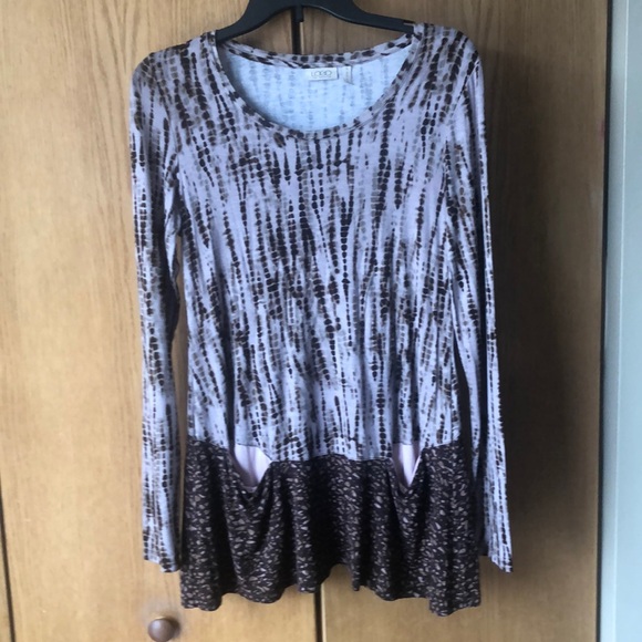 Brown and maple with pink lined front pockets. Poly/span, fits true to size. Barely worn
