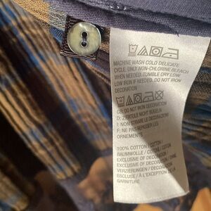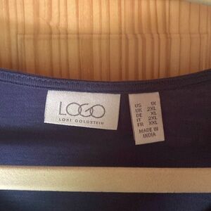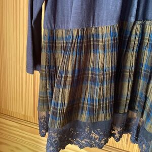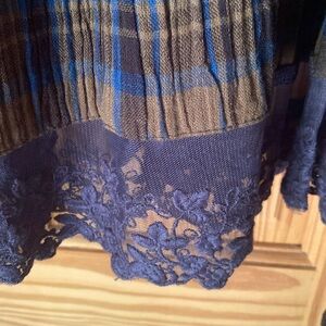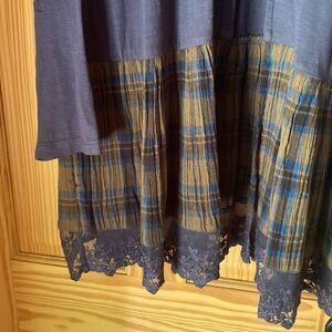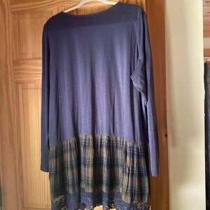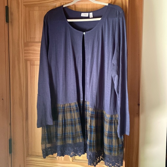 LOGO (Lori Goldstein) top, slate blue with plaid and lace trim at bottom of garment, one button closure, 2 pockets, size 1X, 100% cotton. New with no tags.