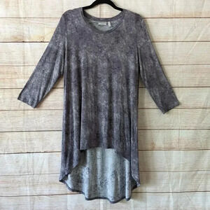 LOGO Layers Lori Goldstein Size S Distressed Print High-Low Hem Knit Tunic Top Purple Gray Stretchy