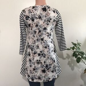 Features: printed front and back; stripe-printed 3/4-length sleeves and side panels; front patch pockets; hi-low hemline