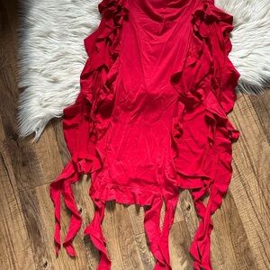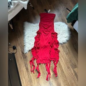 LOINESS Rendezvous Strapless Ruffle Midi Dress In Red