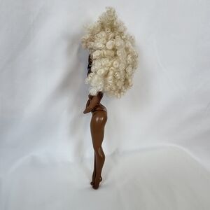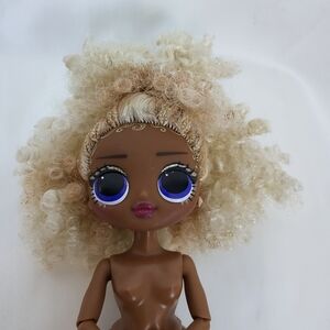 This charming L.O.L. holiday fashion doll features striking blonde glittery curly hair, large vibrant blue eyes, gold earrings, 10 inches tall, 2 inches wide at the hips, has a small scuff on the left side of her forehead, comes nude without accessories, and she's missing her hands. Perfect for OOAK creations, replacement pieces, etc.