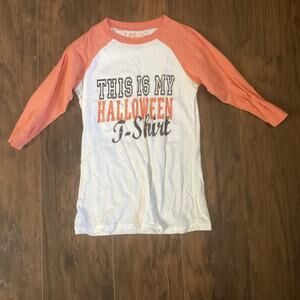White and orange fun word Art Halloween t-shirt by LOL Vintage in good preowned condition. Some piling from washing. No other flaws.