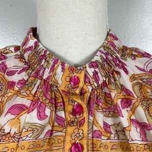 Beautiful boho paisley print blouse with ruffle chest accents and slightly puff sleeve