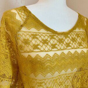 LOLA Mustard Yellow Lace Cropped Dolman Short Sleeve Top L