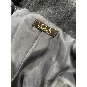 Lola brand gray wool-like coat. The style is a double-breasted peacoat or trench coat with a large, ruffled collar.