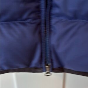 Experience warmth and style with the beautiful Blue Puffer Jacket, featuring a sleek quilted design and a cozy hood. This jacket offers a fitted silhouette and a longer length for added coverage, making it perfect for cold weather adventures. Coat can be zipped up from bottom or top down. Great roofing detail on the side one small little chair in the back that could easily be sewn