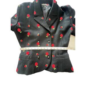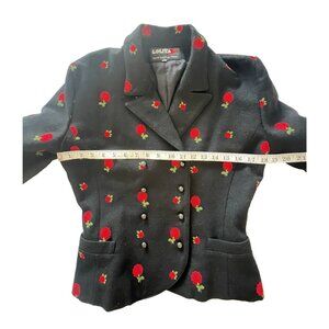 The jacket features a beautifully embroidered rose design on black wool fabric, with a button closure and a collared neckline.