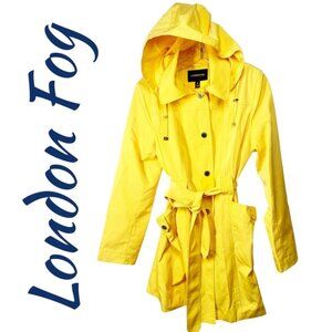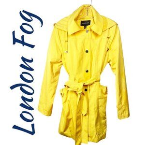 LONDON FOG Bright Yellow Fisherman Trench Raincoat Hood Belted, Size Medium